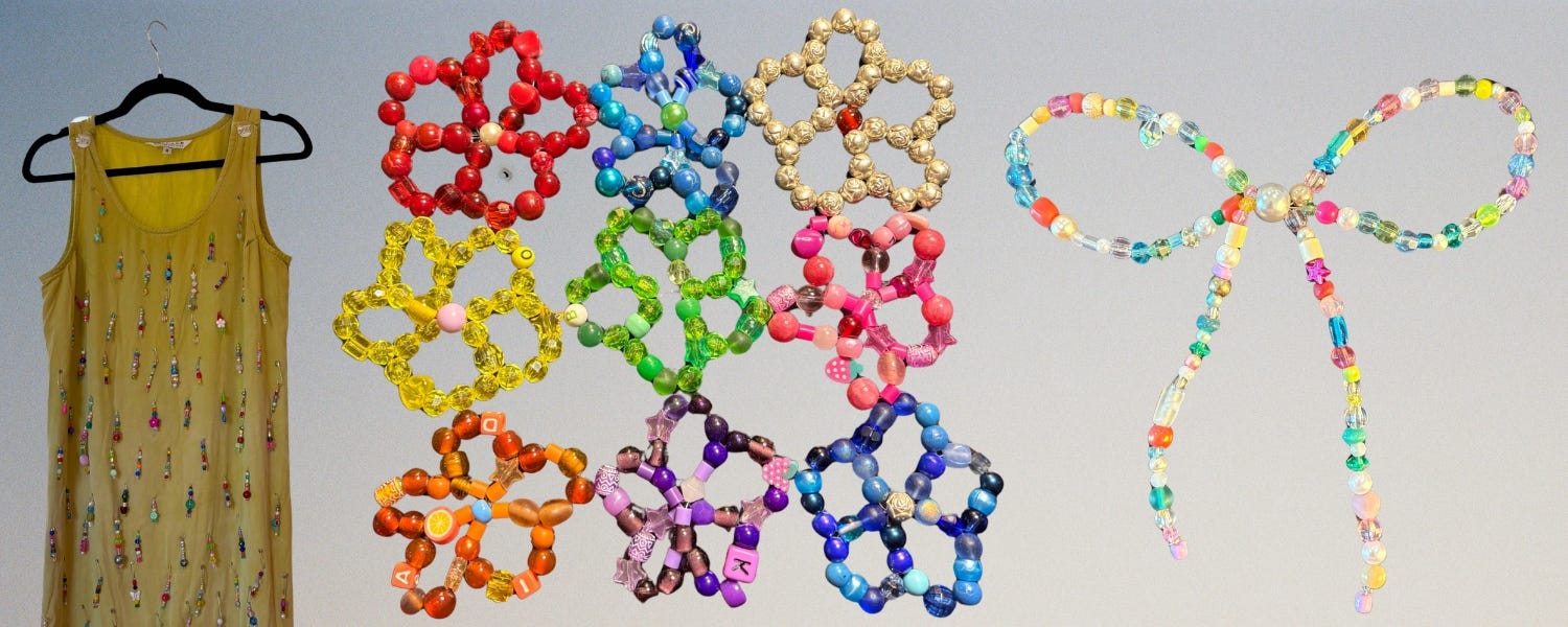 I spent more than 8 hours in March experimenting, a category I select when I’m working on something that I don’t know what it’s going to turn into or I don’t quite know how to classify it. This month, that meant sewing beaded head pins onto a linen dress, making a bunch of beaded flowers, and working on my beaded bow pattern.