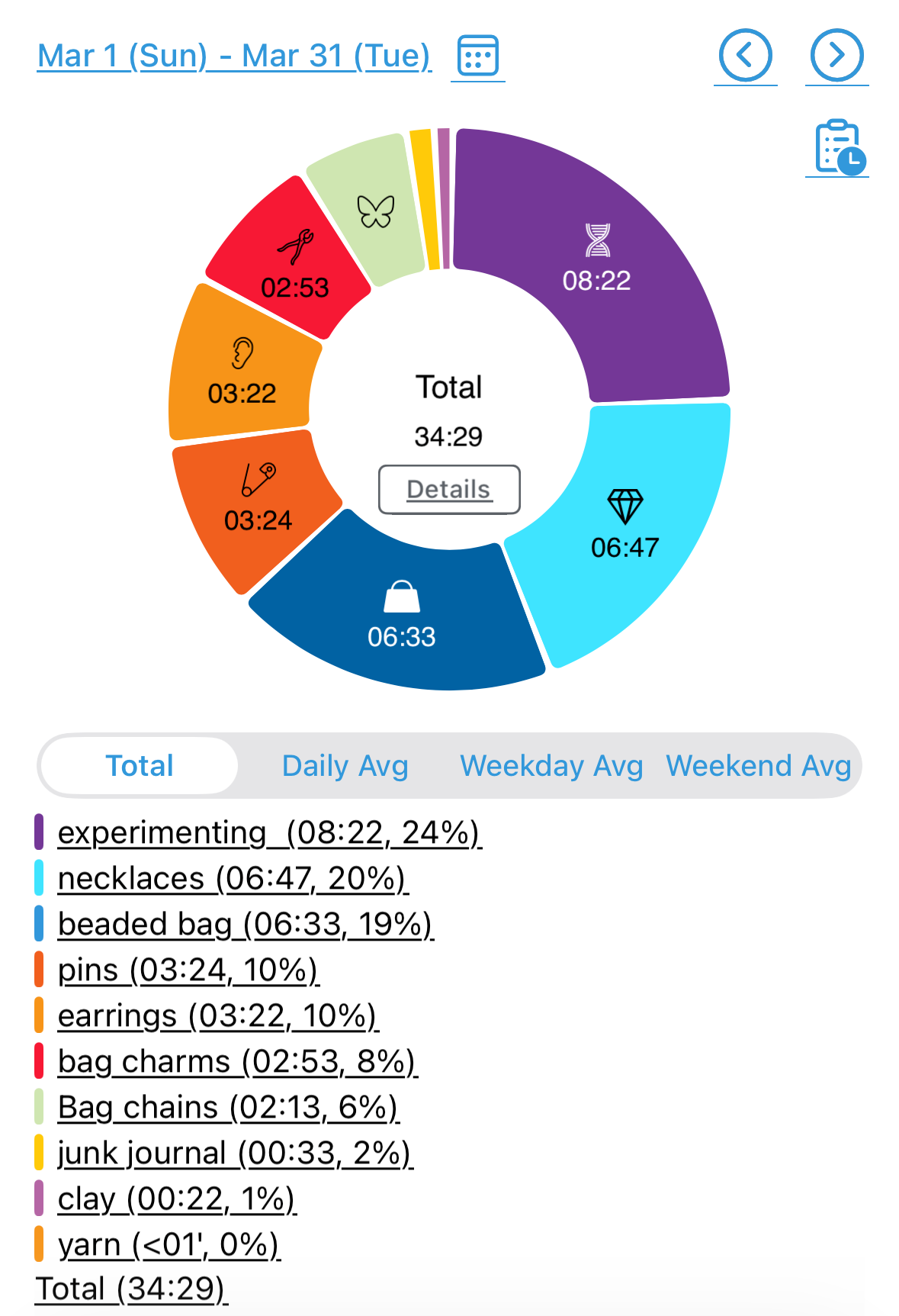 I track all the crafting I do in an app called Atracker that my friend Eliana turned me onto. It turns all my work over the course of the month into a cool chart that I can track throughout the month, which is how I know that I only spent 30 minutes junk journaling in March.